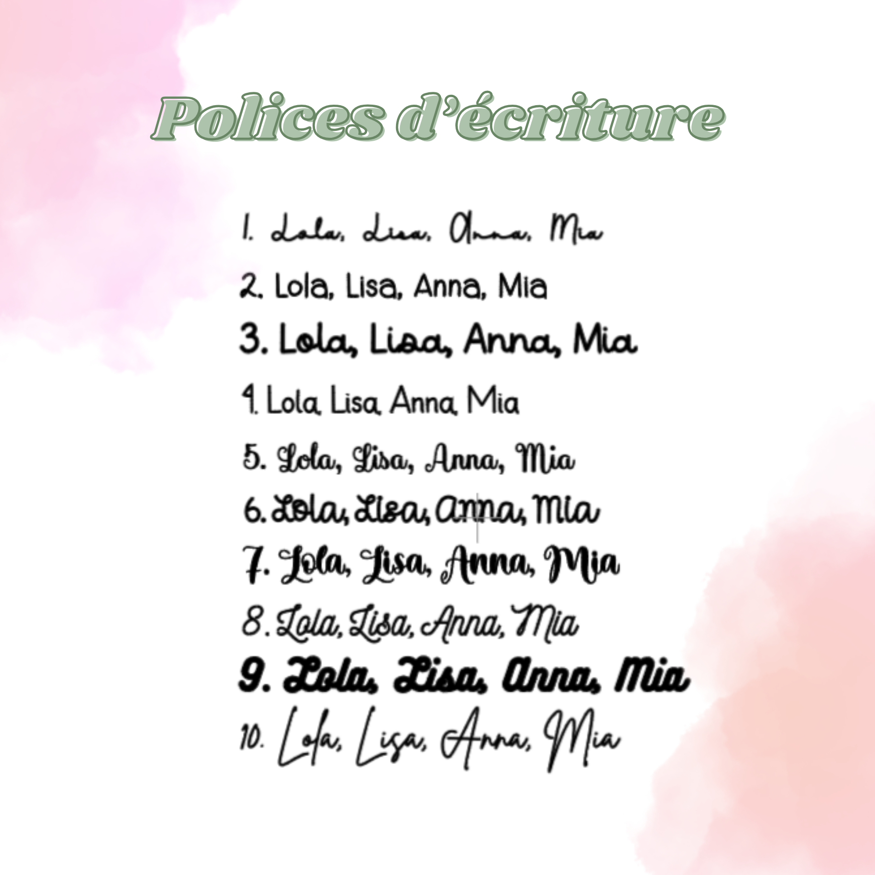 Pour choisir votre police, vos couleurs ou vos symboles, contactez-moi directement sur Instagram : @lalina_creations. Je vous montrerai toutes les options disponibles